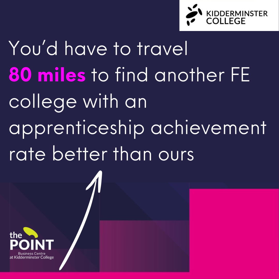 Kidderminster College is proud to announce that their latest apprenticeship achievement rate is 16% above the national average based on the latest results from 2022/2023.