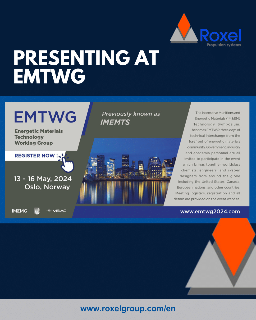 We are proud to be supporting and presenting at the next Energetic Materials Technology Working Group (EMTWG) on 13th to 16th May 2024 in Oslo. EMTWG is the major international forum for exchanging and sharing information on the latest advancements in IM and EM technology.