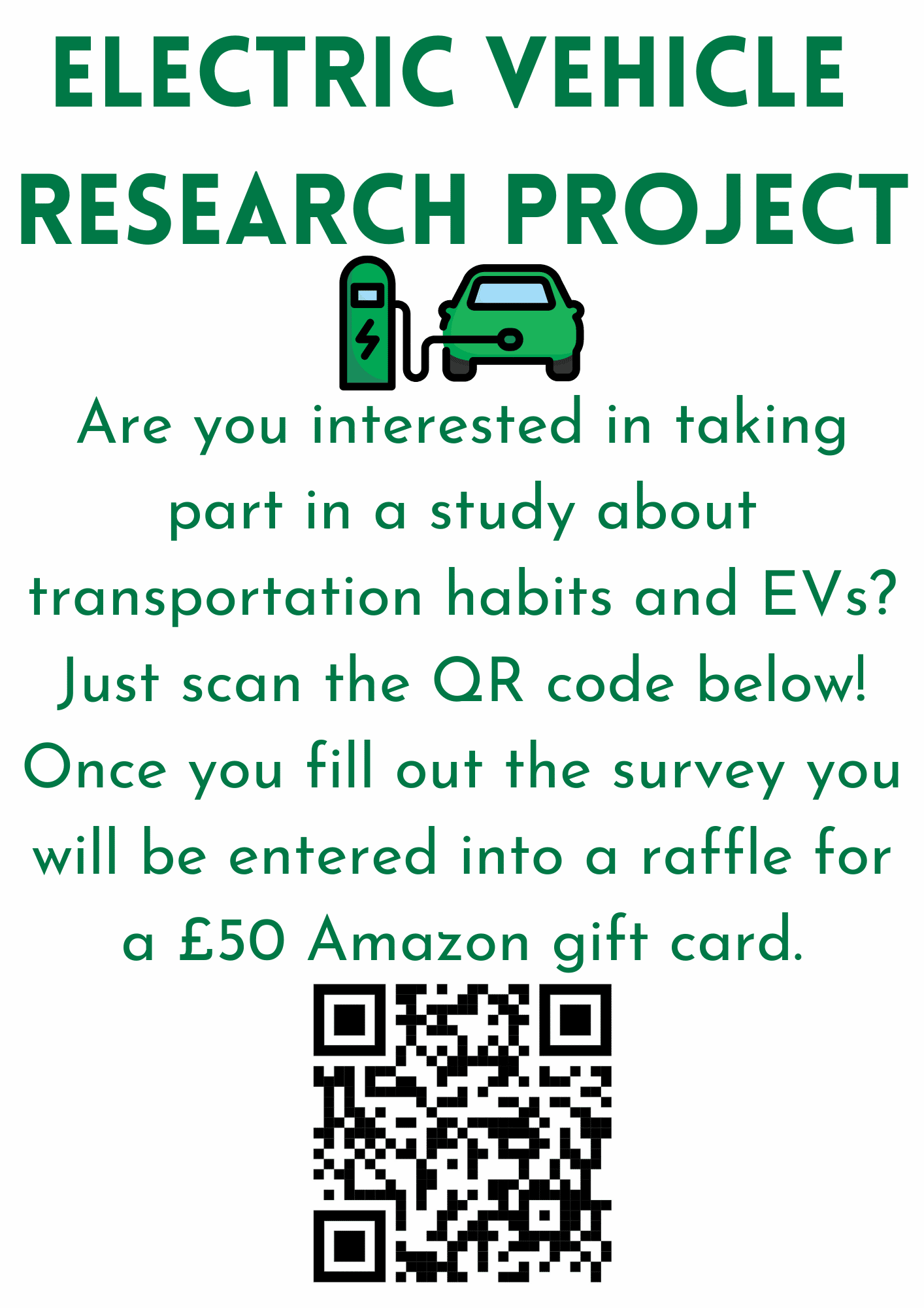 We are a group of university students from the Worcester, MA, USA working with the University of Worcester to research the electric vehicle infrastructure in the Worcestershire County. If you could please take the time to fill out this survey it would provide us with valuable information for our research. It should not take longer than 5-10 minutes to complete. By participating you can be entered into a raffle for a £50 Amazon gift card. If you have any questions, please feel free to message us at [email protected].